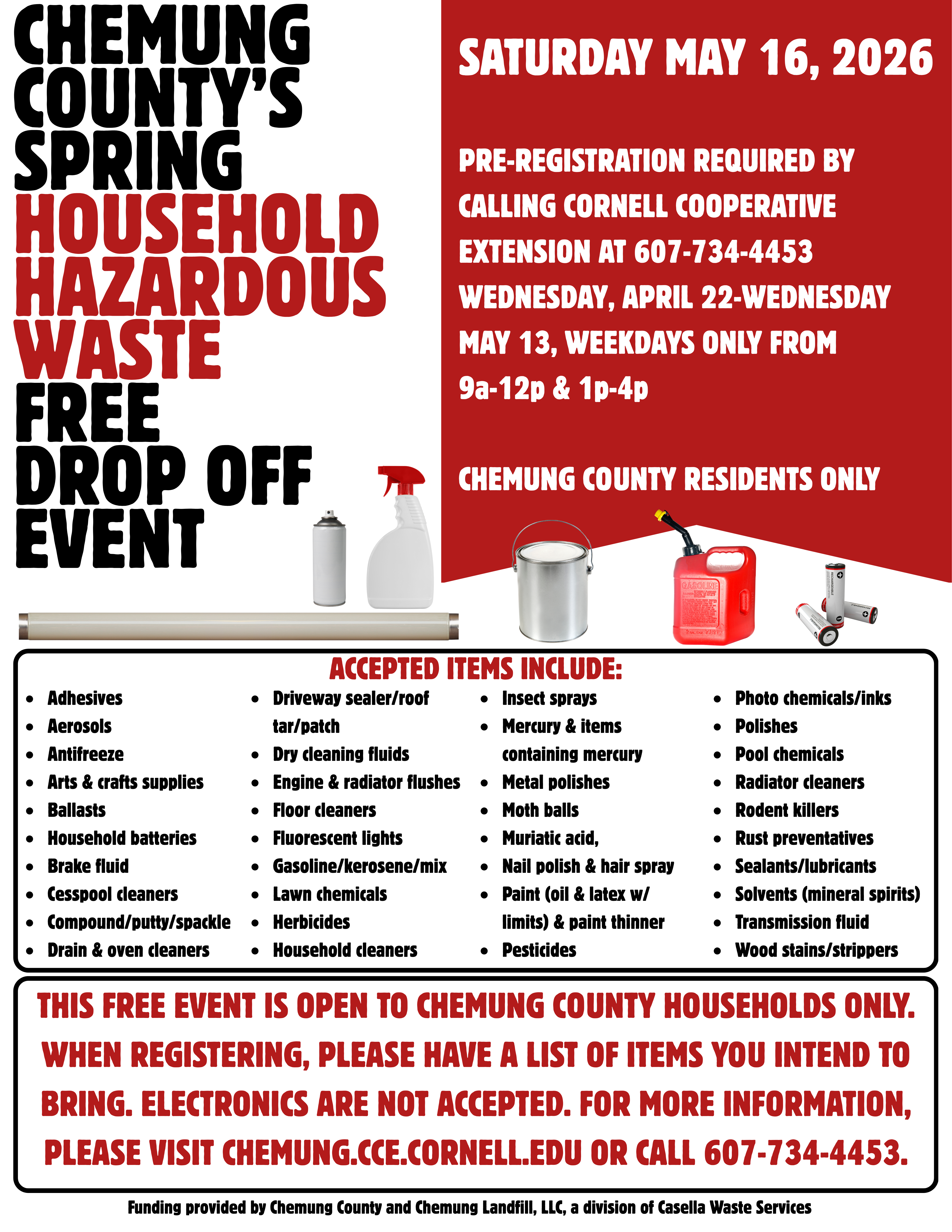 Chemung County’s Spring Hazardous Waste Free Drop Off Event. Saturday May 16, 2026. Pre-registration required by calling Cornell Cooperative Extension at 607-734-4453 Wednesday, April 22-Wednesday, May 13, weekdays from 9a-12p & 1p-4p. Chemung County residents only. When registering, please have a list of items you intend to bring. Electronics are not accepted. For more information, please visit chemung.cce.cornell.edu or call 607-734-4453.
